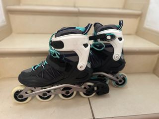 Patines en línea en color negro, blanco y turquesa. - Cierre de velcro y cordones. - Ruedas de poliuretano. - Talla 41.
