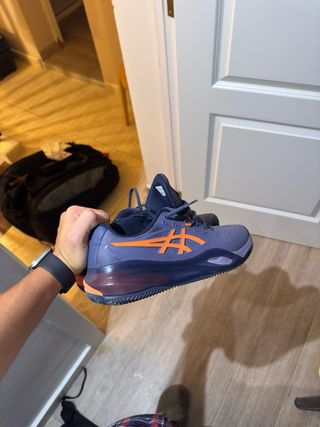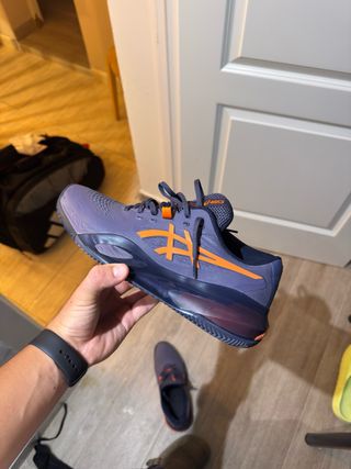 Zapatillas de tenis Asics Gel-Resolution para tierra batida en color morado. - Talla 43.5. - Diseño deportivo con detalles en naranja. - Suela específica para pistas de arcilla.
