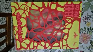 Zapatillas de baloncesto Puma con un diseño llamativo. - Diseño con cortes orgánicos en rojo sobre fondo amarillo. - Estampado gráfico en los laterales. - Logo de Puma en la parte inferior.