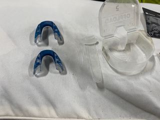 Protector bucal de color azul, ideal para deportes de contacto. Incluye su estuche para guardarlo. - Dos protectores bucales. - Estuche de plástico.