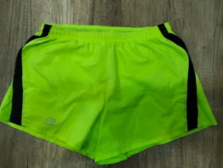 Pantalón corto de running de Decathlon en color amarillo lima con detalles laterales en negro. Talla M (equivalente a 38). - Cintura elástica. - Tejido ligero y transpirable. -Tiene un bolsillo interior y otro exterior con cremallera. -Tiene braguero interior.