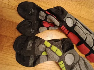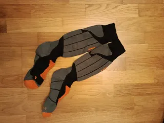Medias térmicas diseñadas para esquí o actividades de montaña. Talla 39 a 42. - Diseño ergonómico para mayor comodidad. - Tejido transpirable y cálido. - Refuerzos en talón y puntera. - Color gris, negro y naranja. -Muy abrigados En buen estado