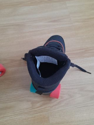 Patines de bota negros de la marca Oxelo, talla 32. Ideales para iniciarse en el patinaje. - Diseño de bota alta. - Ruedas de colores (dos turquesas y dos rojas). - Cordones negros. - Detalle de ribete en color coral.