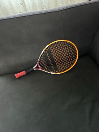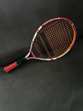 Raqueta de tenis Babolat junior con un diseño llamativo. - Marco en tonos rojos y blancos. - Cuerdas naranjas. - Empuñadura roja con cinta negra.Necesita cambiar empuñadura.