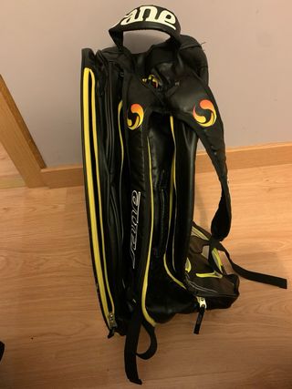 Paletero de la marca Sane en color negro. Presenta un diseño llamativo con detalles en amarillo y plateado. - Diseño con logo Sane. - Acabado en material sintético. - Cierre de cremallera.