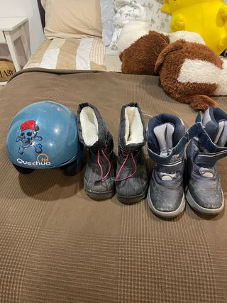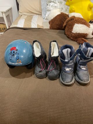Conjunto de casco de esquí y botas para la nieve o lluvia. - Casco azul de la marca Quechua con diseño de calavera. - Dos pares de botas de invierno, uno negro con cordones rosas y otro azul marino.
