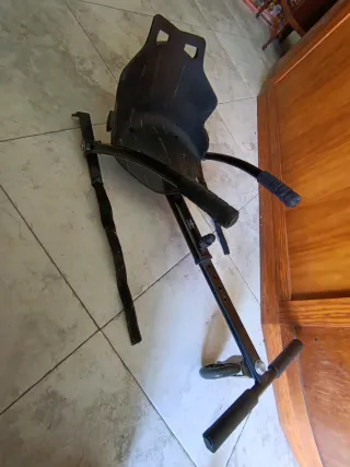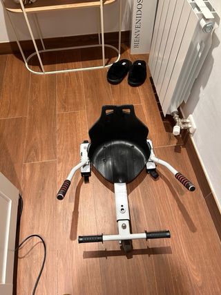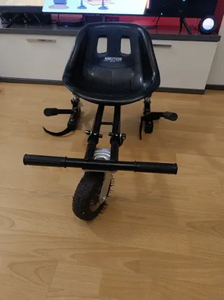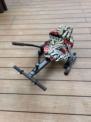 Este accesorio convierte tu hoverboard en un kart. -Se ha usado 1 vez - Estructura metálica negra. - Asiento con diseño gráfico. - Manillares para control.