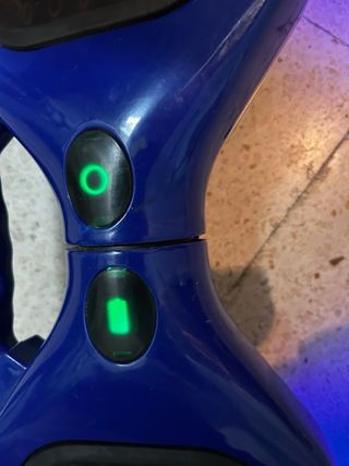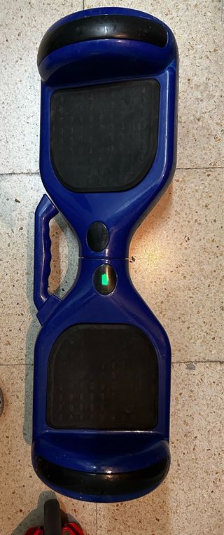 Hoverboard de color azul brillante, con plataformas antideslizantes y un diseño moderno. - Plataformas con textura para mayor agarre. - Diseño ergonómico y aerodinámico. - Asa central para facilitar el transporte. Está averiado, para manitas