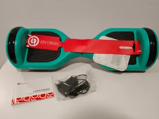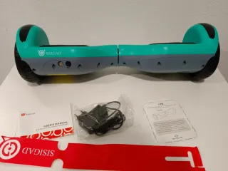 Hoverboard con un diseño de galaxia azul, en buen estado. - Ruedas con luces LED. - Diseño espacial. -Bateria modificada por una mas potente y mejor calidad. -Dos cargadores de carga rapida y normal + adaptador Asia. -Funda para transportar el hoverboard. -Sistema para poner música desde bluetooth. -Sistama de frenado automatico a partir de 15 kilometros hora. -Tiene rallajos debajo del patin, no afecta a nada ni se nota al circular. -Marca del producto es SISIGAD -Pesa 6.5 k, es facil de coger si se acaba la bateria -Es adecuado para niños hasta 50 kilos