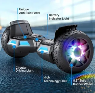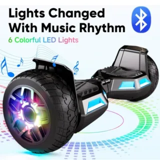Hoverboard con un diseño vibrante y moderno, ideal para desplazarse de forma divertida. - Conectividad Bluetooth para música. - Luces LED integradas.