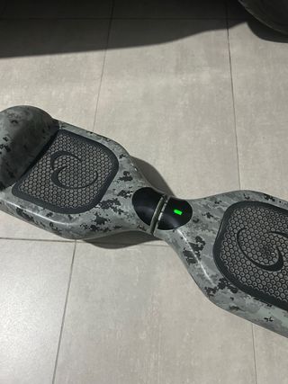 Hoverboard con un diseño de camuflaje en tonos grises. - Diseño de camuflaje gris. - Marca SmartGyro. - Luces azules al montarte. Tiene un par de años se ha usado y tiene varios arañazos pero va perfecto, incluye cargador, esta en buenas condiciones solo desgastes de uso. Precio algo negociable