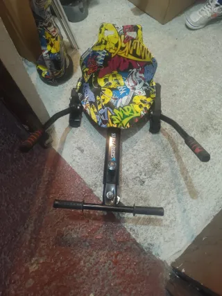 Hoverboard con accesorio de asiento tipo kart, ideal para niños. Cuenta con luces LED en las ruedas.Falla la batería.De Ahí el precio.Hay que comprar una. - Diseño con gráficos coloridos. - Asiento ajustable.