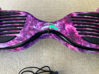 Hoverboard de color morado vibrante, con detalles luminosos. - Luces LED en las ruedas y en los laterales. - Diseño moderno y llamativo. - Con cargador