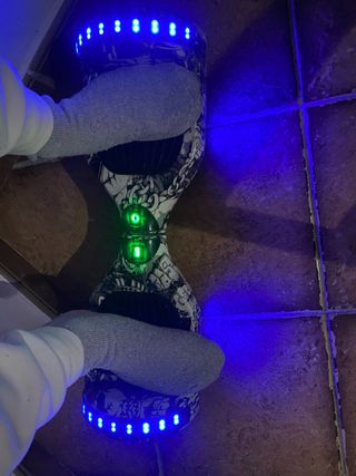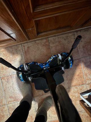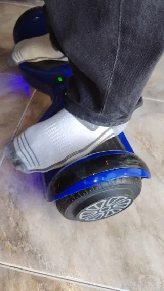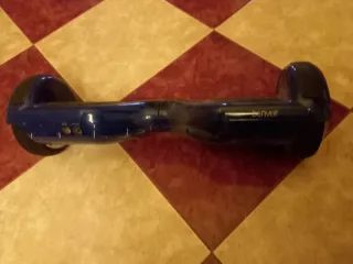 Hoverboard con un diseño llamativo de camuflaje en tonos azules. - Ruedas con luces LED. - Plataformas antideslizantes. Se le ha ido la tarjeta madre, se pueden encontrar repuestos en AliExpress por un precio razonable, a mí no me interesa repararlo, ha estado funcionando un mes