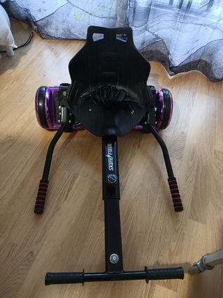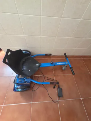 Hoverboard con accesorio de asiento para convertirlo en un kart. Algunas marcas del uso pero en muy buen estado. Apenas se ha usado. Las ruedas están prácticamente nuevas. Con su cargador. Las ruedas se iluminan al funcionar.