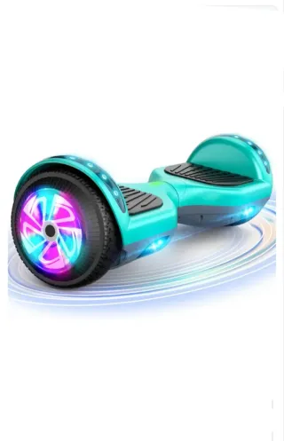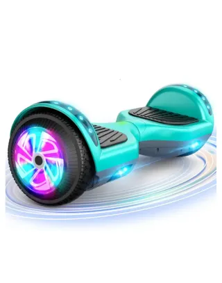Hoverboard de color turquesa con ruedas iluminadas y conexión Bluetooth. - Luces LED en las ruedas. - Conexión Bluetooth para música. - Diseño moderno y llamativo.