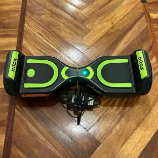 Hoverboard de la marca Nilox en color negro con detalles en verde brillante. Incluye cargador. - Diseño moderno y deportivo. - Luces LED frontales. - Plataformas antideslizantes.