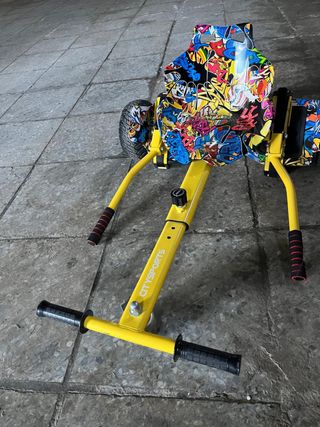 Accesorio para convertir tu hoverboard en un kart. - Asiento con diseño llamativo. - Manillar para control. - Ruedas para movimiento.