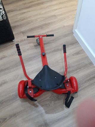 Se vende silla kart hoverboard de color rojo. Es un modelo robusto y aparentemente en buen estado. - Incluye asiento de plástico negro. - Dispone de dos manillares laterales y uno frontal. - Mecanismo de dirección en el manillar central.