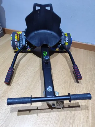 Accesorio tipo kart para hoverboard, con asiento. - Asiento negro. - Estructura metálica. - Rueda delantera. - Brazos ajustables.