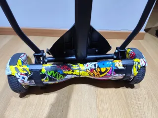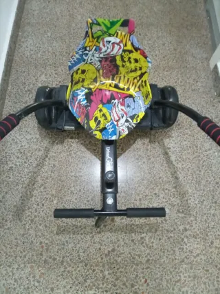 Hoverboard con asiento para deslizarse. - Diseño llamativo con estampado de cómic. - Manillar negro con empuñaduras rojas y negras. - Estructura negra. - Ruedas negras. Para niños de hasta unos 12 años. A mi hijo se le ha quedado pequeño. Su precio original fueron 200€