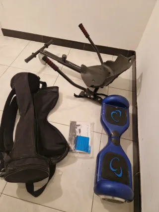 Se vende hoverboard blanco junto con un accesorio para convertirlo en un kart. - Hoverboard de color blanco. - Accesorio de kart negro. ⚠️Detalle⚠️el unico detalle que tiene es que el accesorio para ir sentado utiliza velcro y el velcro está un poco gastado se le puede comprar otro en cualquier sitio. ⚠️ no hay prisa en venderlo y no hago envíos.⚠️