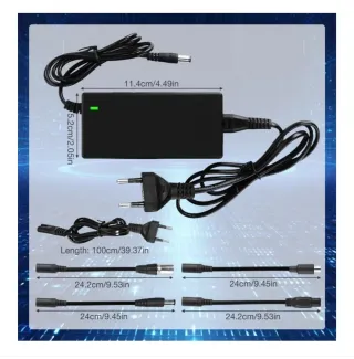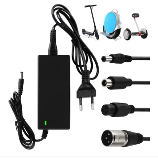 Adaptador de corriente para patinetes eléctricos y hoverboards. Incluye varios tipos de conectores para mayor compatibilidad. - Color negro. - Indicador LED de carga. 42V 2A Cable de Carga para Hoverboard, Cargador Patinete Electrico con indicador de Carga LED y 4 Puertos de Interfaz Cargador, Electric Scooter Adapter Charger para Bicicleta de Equilibrio