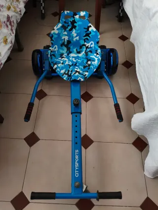 Hoverboard Citysports con un diseño llamativo de camuflaje azul. - Asiento con estampado de camuflaje. - longitud ajustable - Ruedas negras. -usado poco -con cinta de recambio PRECIO NEGOCIABLE