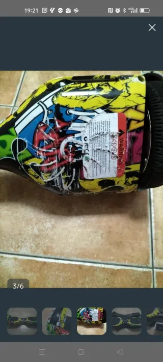 Hoverboard con un llamativo diseño de graffiti. - Rueda plateada con detalles negros. - Carcasa multicolor con estilo urbano.