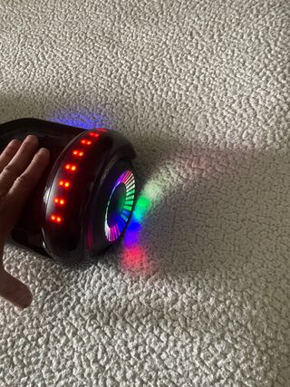 Hoverboard de color negro con un diseño moderno y luces LED. - Luces LED rojas en la parte trasera. - Indicador LED verde en el centro. - Marca: GYROOR. Funciona , pero creo que hay que calibrar o para piezas. Tiene cargador