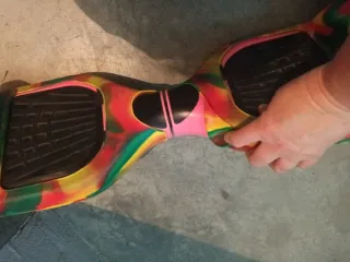 Hoverboard con un diseño llamativo y multicolor. Ideal para desplazarse de forma divertida. - Diseño con remolinos en rojo, amarillo y verde. - Plataformas antideslizantes negras. - Es rosa, pero de regalo lleva una funda multicolor. - Se vende también la silla, juntos o por separado