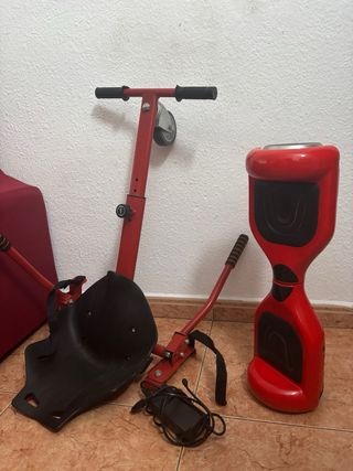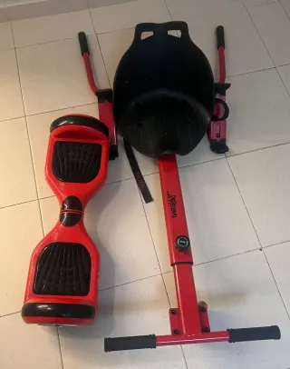 Se vende conjunto de hoverboard y silla tipo go-kart en color rojo. Solo el patin 50€ Solo la silla 40€ Las dos juntas 80€ - Hoverboard de dos ruedas. - Silla con asiento negro y estructura roja. - Manillar ajustable.