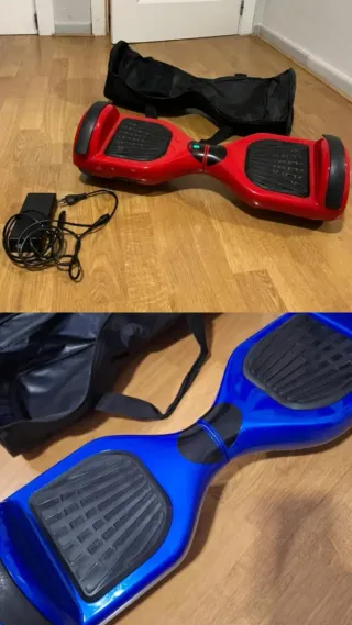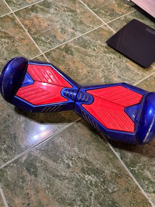 Hoverboard con un diseño llamativo en azul y rojo. - Plataformas antideslizantes en color rojo. - Carcasa exterior en color azul brillante. -Esta con muchos golpes ya q tiene 6 años y es de jugar con el y caer. -Va perfectamente -te va con cargador incluido