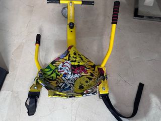 Hoverboard con asiento para deslizarse. - Diseño llamativo con estampado de cómic. - Manillar negro con empuñaduras rojas y negras. - Estructura negra. - Ruedas negras. Para niños de hasta unos 12 años. A mi hijo se le ha quedado pequeño. Su precio original fueron 200€