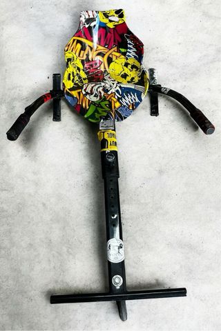 Silla para hoverboard con un diseño llamativo y colorido. - Estructura de color amarillo. - Asiento con estampado de grafitis. - Mangos con agarre de goma negra y detalles rojos. - Correas de sujeción negras.
