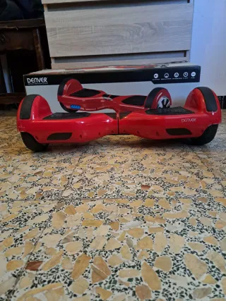 Hoverboard Denver de color rojo brillante. Diseñado para el equilibrio y la diversión. - Plataformas antideslizantes. - Ruedas negras. - Diseño moderno y aerodinámico. - Batería recién cambiada - Tiene algunos rascazos en la carcasa, la cual se puede cambiar