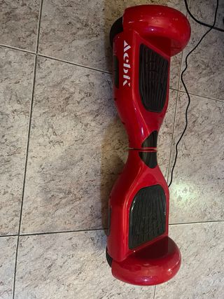 Vendo hoverboard en buen estado, con algunos signos de uso visibles en la funda roja. Incluye cargador. - Modelo de hoverboard con funda protectora roja. - Presenta algunos desperfectos estéticos en la funda. - Se incluye el cargador original.