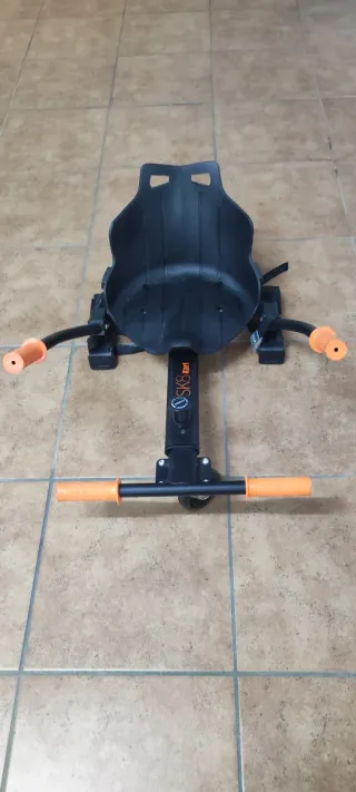 Accesorio para convertir un hoverboard en un kart. - Asiento ergonómico. - Manillar con empuñaduras naranjas. - Estructura metálica negra.