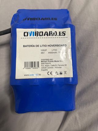 Batería de litio para hoverboard de la marca Oviboard. - Voltaje: 36V - Capacidad: 4400mAh - Modelo: 10S2P - Importado por Mohair Pronto Moda S.L. - Dirección: Pol. Asipo, Calle B, Parcela 58, 33428 Llanera-Asturias, España