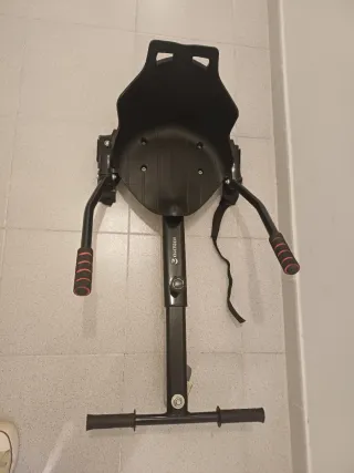 Asiento diseñado para acoplar a un hoverboard, transformándolo en un kart. - Estructura de metal negro. - Asiento ergonómico de plástico negro. - Mangos de agarre con acolchado rojo y negro. - Barra de soporte inferior con mangos negros.