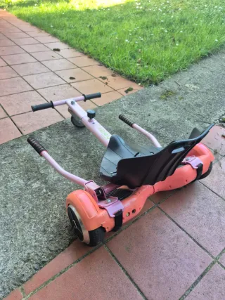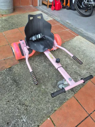 Este accesorio transforma tu hoverboard en un divertido go kart. - Color rosa. - Asiento negro. - Pedalera ajustable. Se regala el Hoverboard pero no funciona, debe ser la bateria, quiza se pueda reparar. No se envia.
