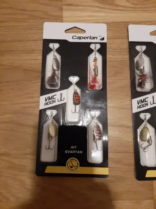 Pack de dos kits de cucharillas de pesca Caperlan totalmente sin estrenar. Pago y envío por Wallapop. NO ACEPTO CAMBIOS NI REGATEOS. NO RESERVO. Precio por los dos juntos - Cucharillas con anzuelos VMC. - Diseños variados para diferentes condiciones de pesca.