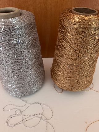Juego de 2 conos de hilos con lentejuelas. Colores: beige/dorado y gris claro/plateado. Peso: 354 y 500 gramos. Ver fotos. Los hilos son preciosos y de alta calidad (hecho en Italia). Entrega rápida.