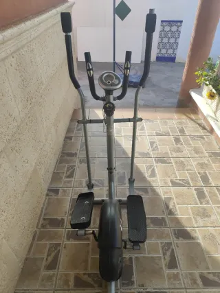 Bicicleta elíptica de color gris, ideal para entrenamientos en casa. - Estructura metálica. - Pedales antideslizantes. - Manillar con empuñaduras acolchadas.