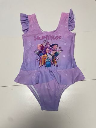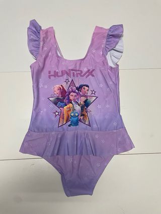 Bañador infantil con estampado de Huntrix y estrellas. - Diseño con volantes en las mangas. - Falda incorporada. - Colores degradados en tonos morados y rosas. Dime talla y modifico anuncio A estrenar