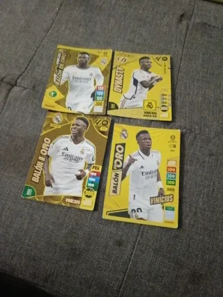 Lote de 4 cromos de Vinícius Júnior de la colección Panini. - 2 cromos Balón de Oro. - 1 cromo Dynasty S. - 1 cromo Balón de Oro con número 468. - Incluyen estadísticas de jugador.