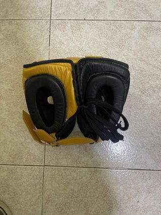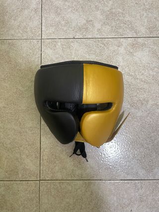 Casco de protección para boxeo o deportes de contacto. Diseño bicolor. - Color negro y dorado. - Cierre con cordones.