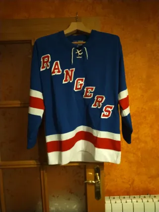 Camiseta de hockey de los NY Rangers. Diseño clásico con los colores del equipo. - Color azul principal. - Bandas rojas y blancas en mangas y cuello. - Nombre 'Rangers' en letras grandes.