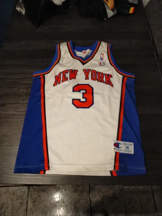 Camiseta vintage de los New York Knicks, modelo de Charles Charles Starks. Ideal para coleccionistas y aficionados al baloncesto. - Color blanco con detalles en azul y naranja. - Número 3 en la parte frontal. - Logo de Champion y NBA. - Talla M.