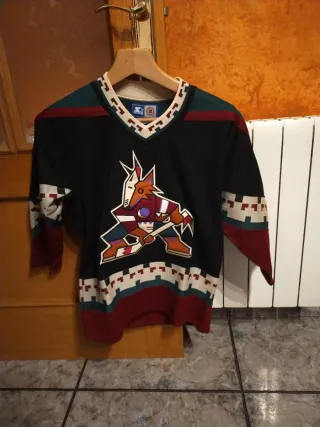 Camiseta de hockey vintage de los Phoenix Coyotes. Diseño con el logo del equipo. - Cuello en V con detalles geométricos. - Mangas largas con diseño tribal. - Colores: negro, rojo, verde, blanco y naranja.
